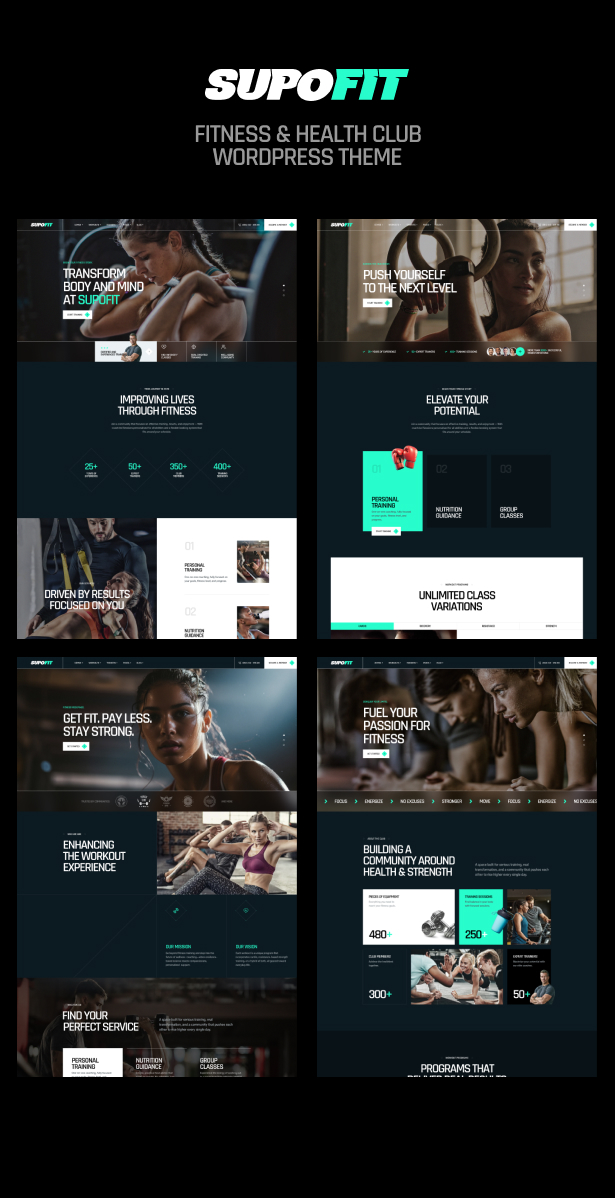 Supofit is a powerful, energetic, and modern WordPress theme crafted for gyms, fitness centers, personal trainers, yoga studios, health clubs, sports coaching, and wellness programs.