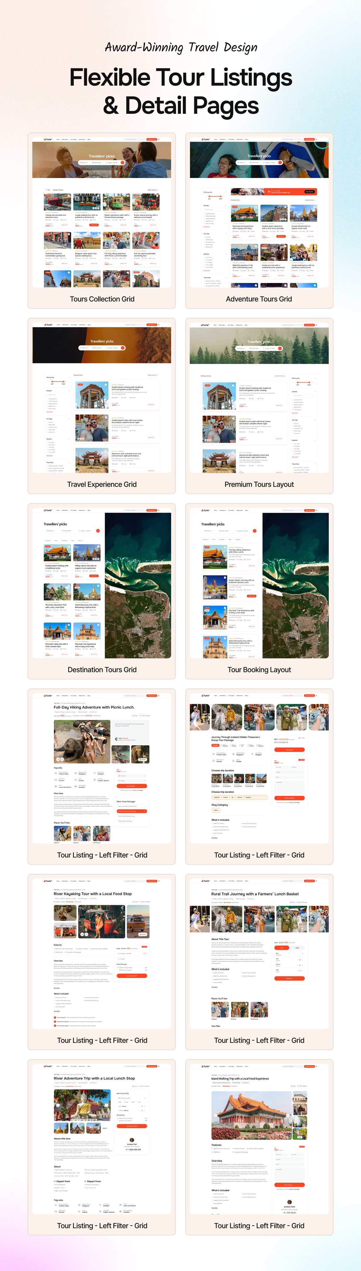 - Destination Page: Highlight top travel destinations with images, travel guides, and recommended tours.