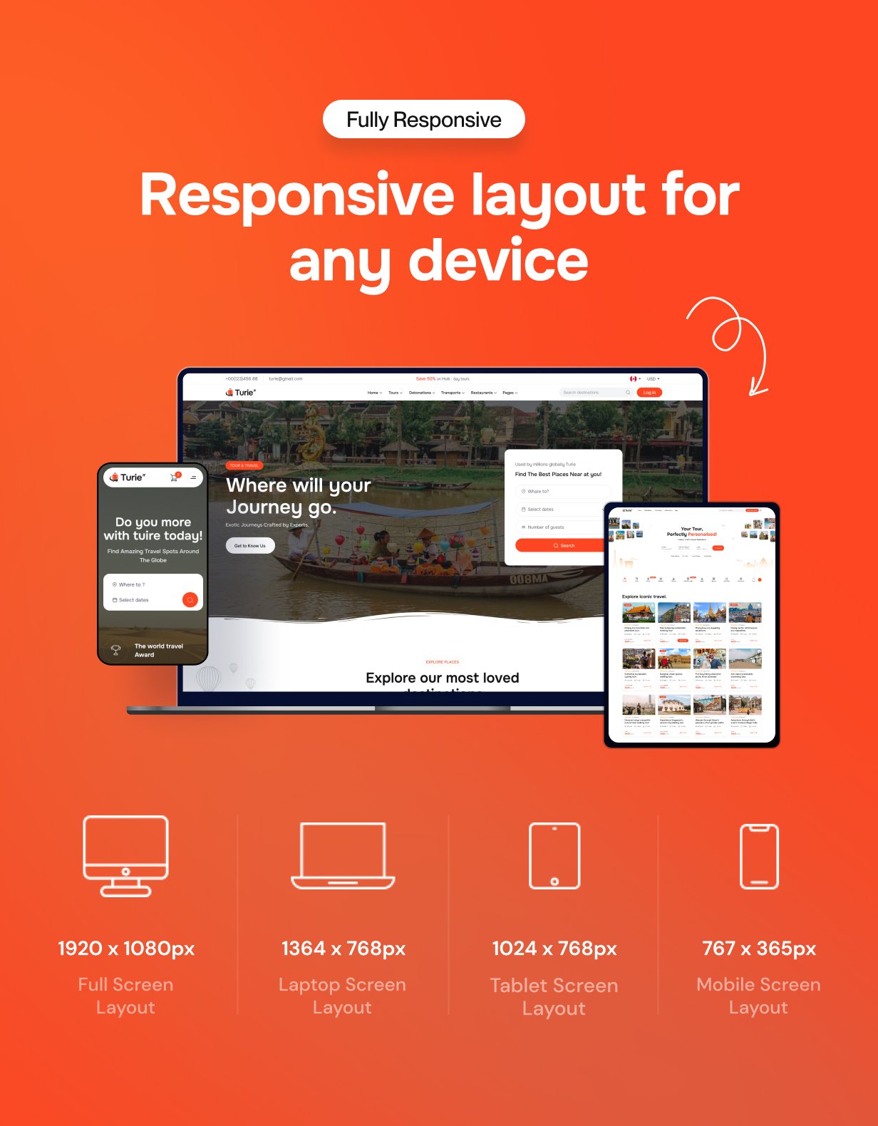 Turie is fully responsive and adapts seamlessly to all screen sizes including desktops, tablets, and smartphones. The retina-ready design ensures sharp images and crystal-clear visuals, providing a premium browsing experience for travelers on any device. -